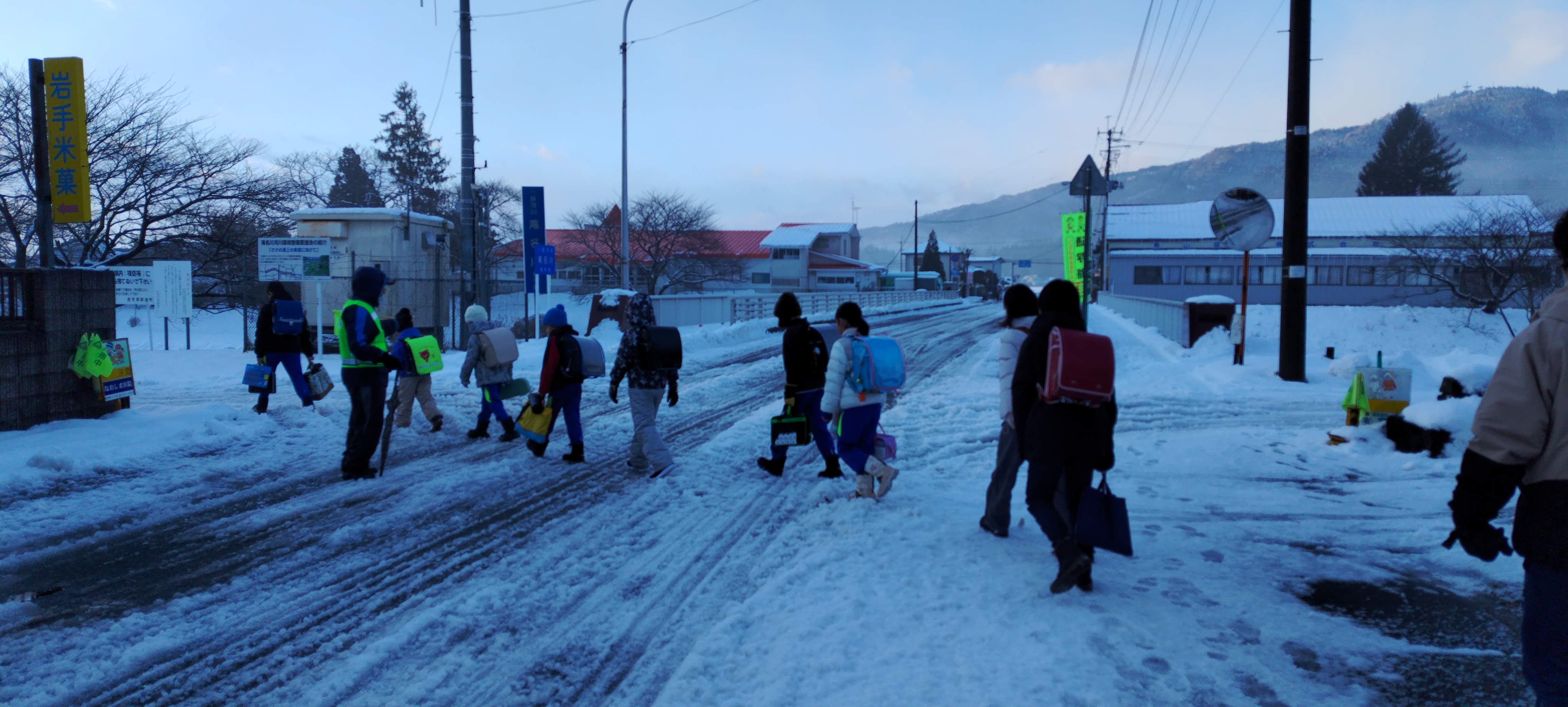 本校では、水分地区と片寄地区の児童はスクールバスを利用していますが、上平沢地区の児童は徒歩登校班を編成して徒歩登校をしています。そこで、1月16日(金)、3学期スタートに際して徒歩登校班の朝の登校指導を行いました。通常はスクールガードボランティアの皆様に見守りをしていただいていますが、しっかりと上級生の指示を聞いて安全に登校できているか確認しました。
