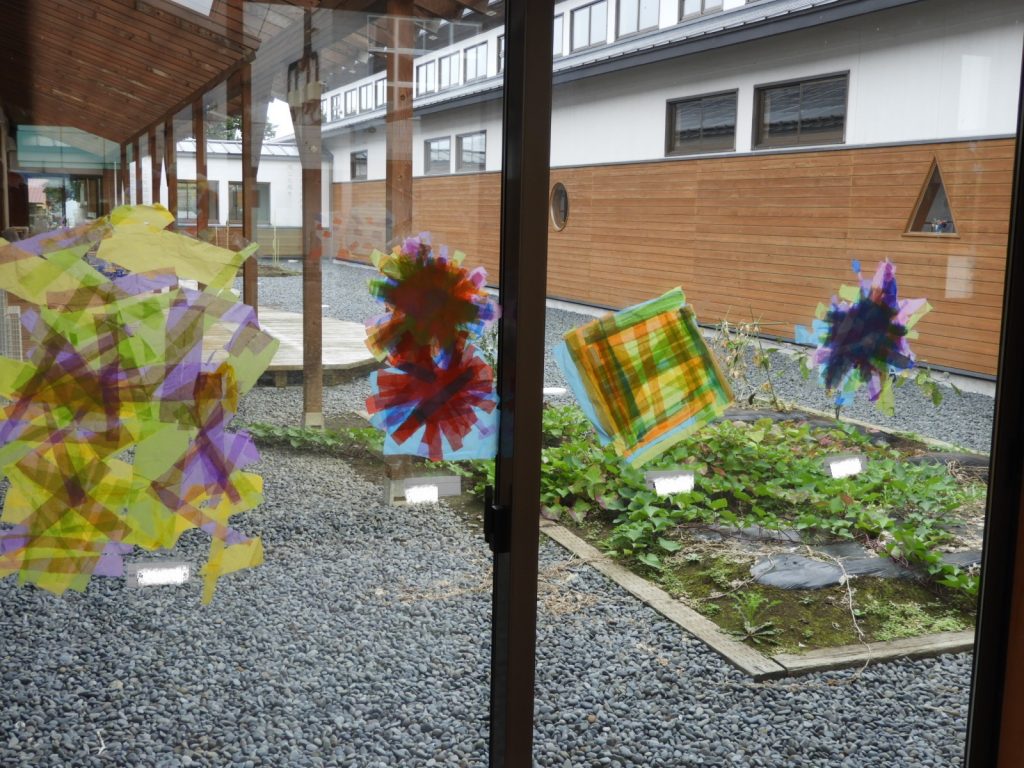 廊下のガラスに子供たちの作品が飾られ、光でキラキラ輝き、とても明るい感じになっています。