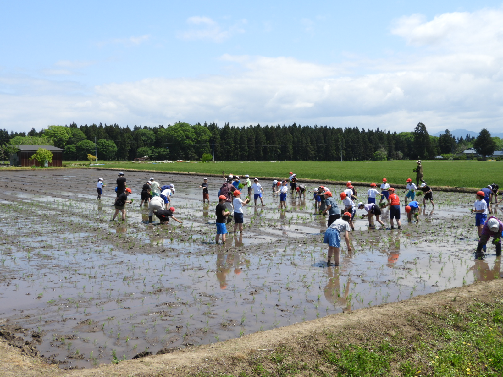 5月24日(水)に地域の方の指導のもと、子供たちは手植えでの田植えに挑戦しました。素足で田んぼに入ると、初めての感触に子供たちからは歓声があがりました。アドバイスを受けながら作業を進めるうちに、次第に慣れた手つきになり、最後は泥んこになりながらも楽しそうに作業をしました。