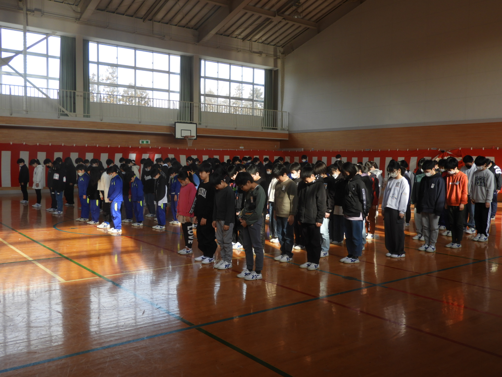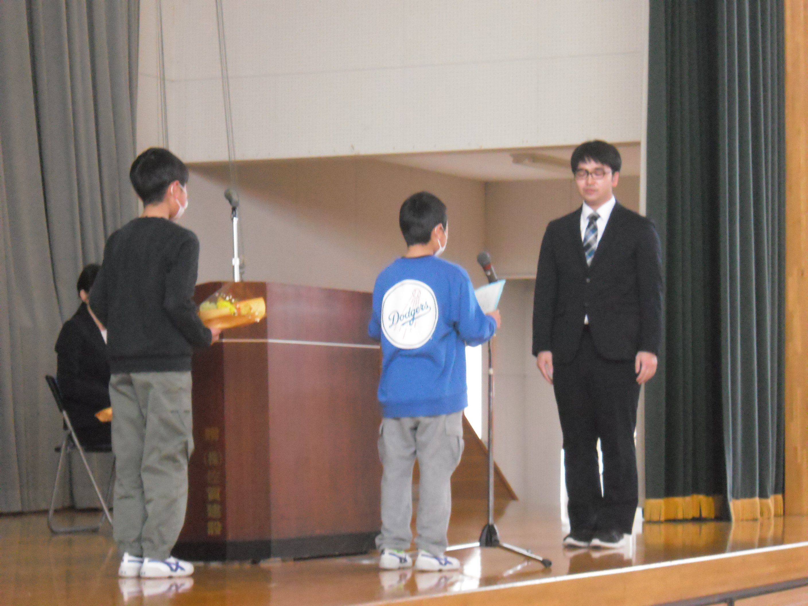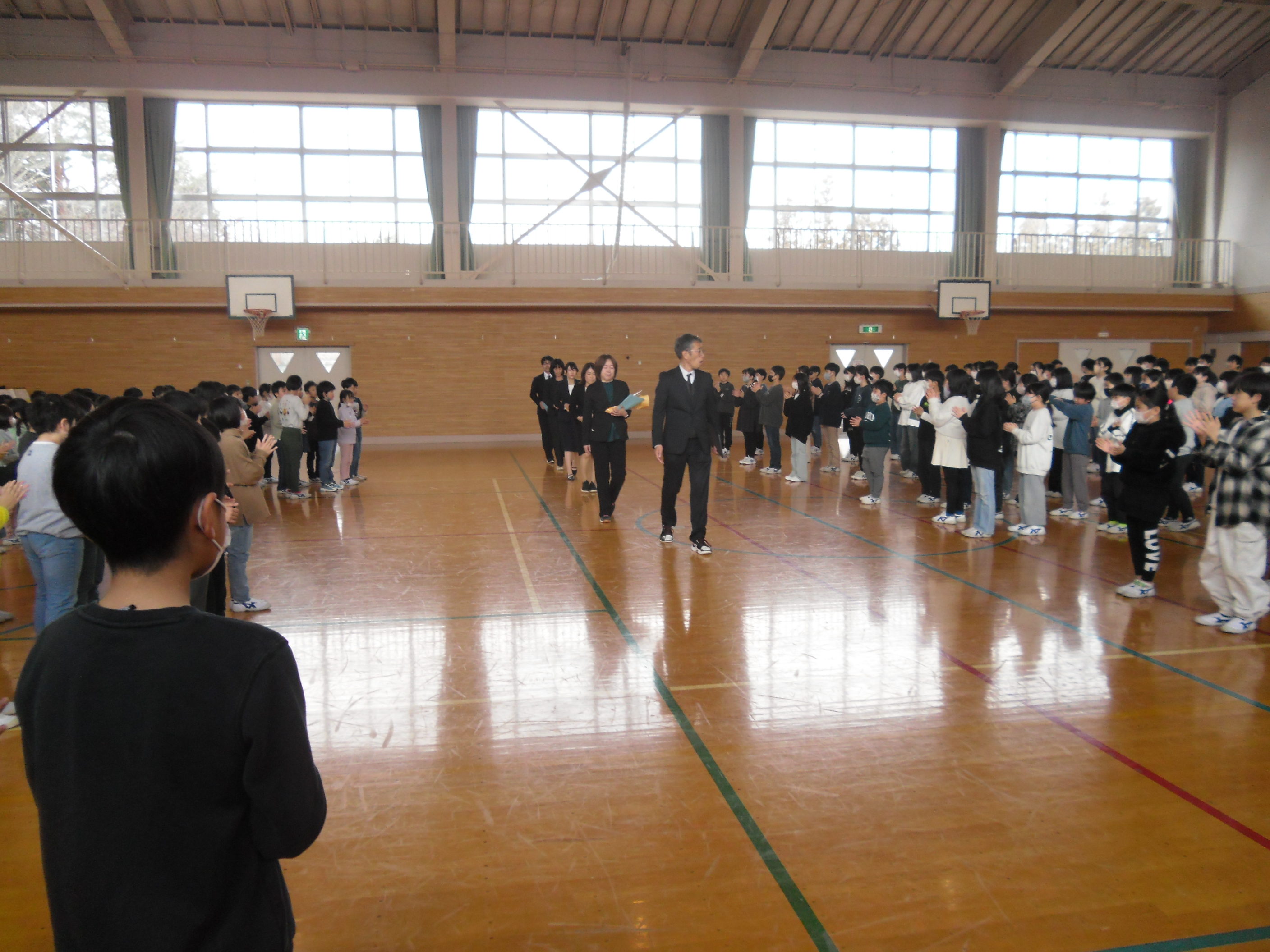 全校児童が体育館に集まり、校長先生から、退職・転出する先生方を紹介していただきました。その後、離任する先生方お一人お一人からお別れの言葉を頂戴しました。子どもたちは、お別れするということを実感し、静かにお話を聞いていました。