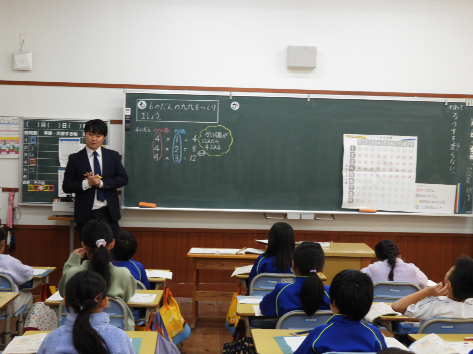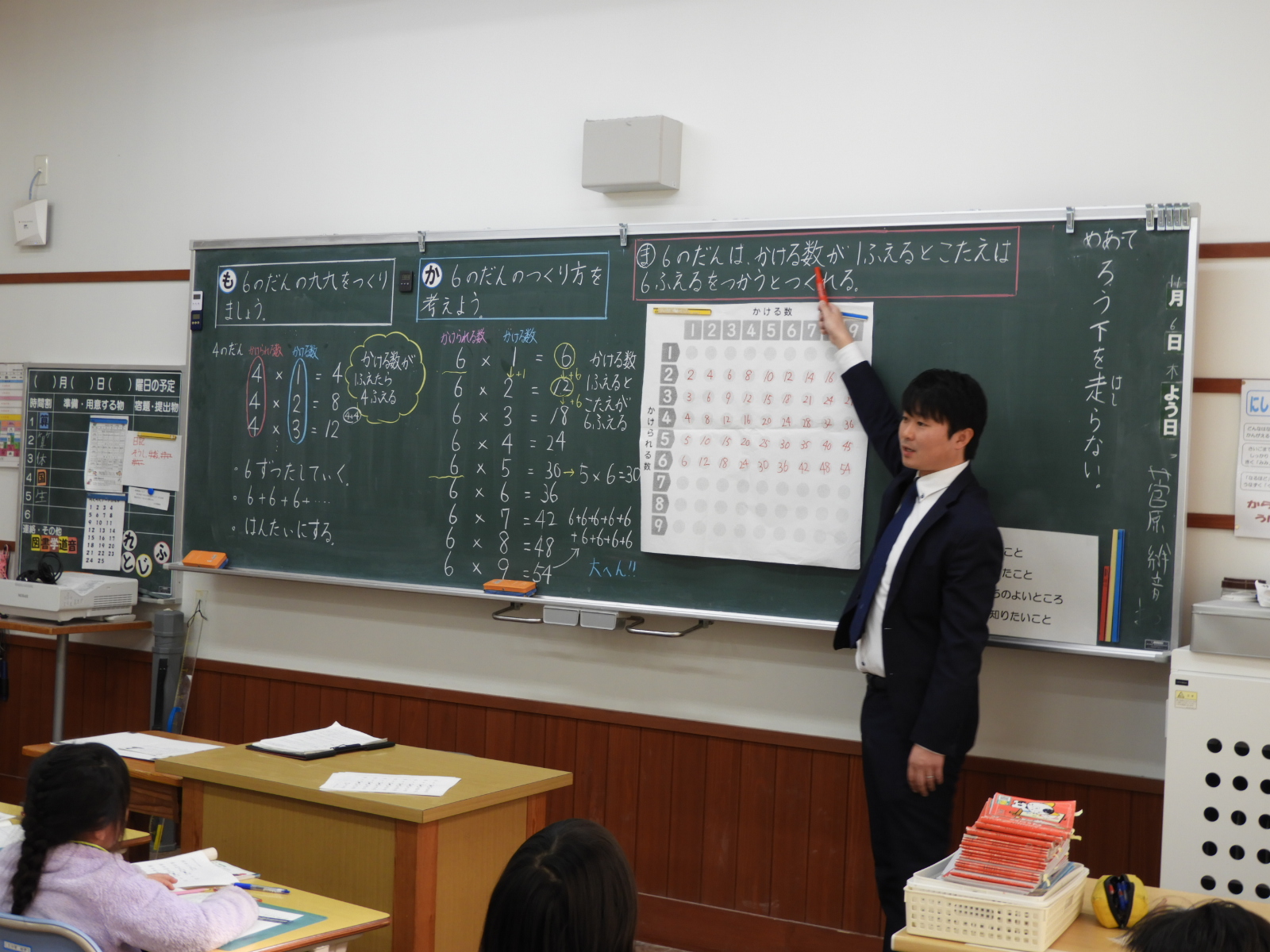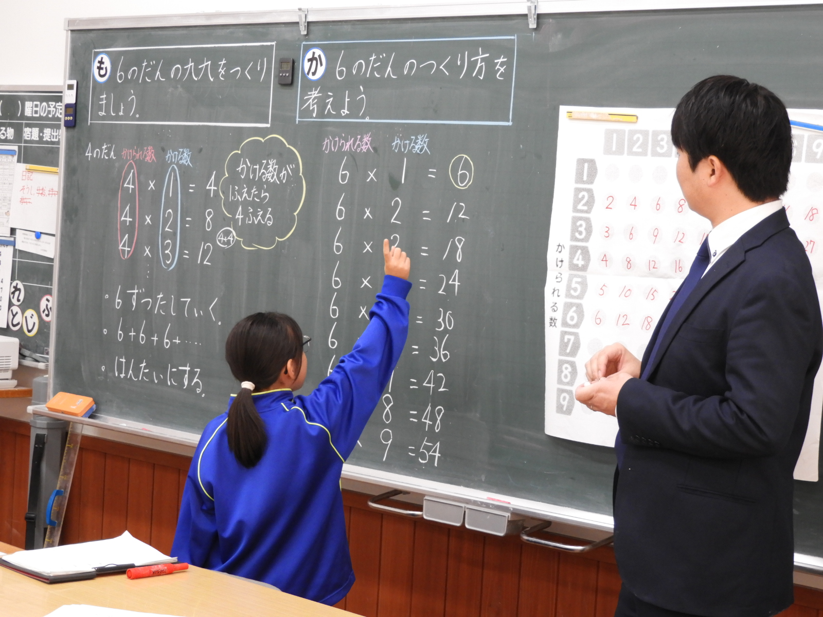 2年生の子どもたちは、とても意欲的に学習に取り組み、「6のだんの九九をつくりましょう」という学習課題のもと、これまでのかけ算九九の学習で学んできたやり方や、数学的な見方・考え方を働かせて、正しい方法を見つけていきました。