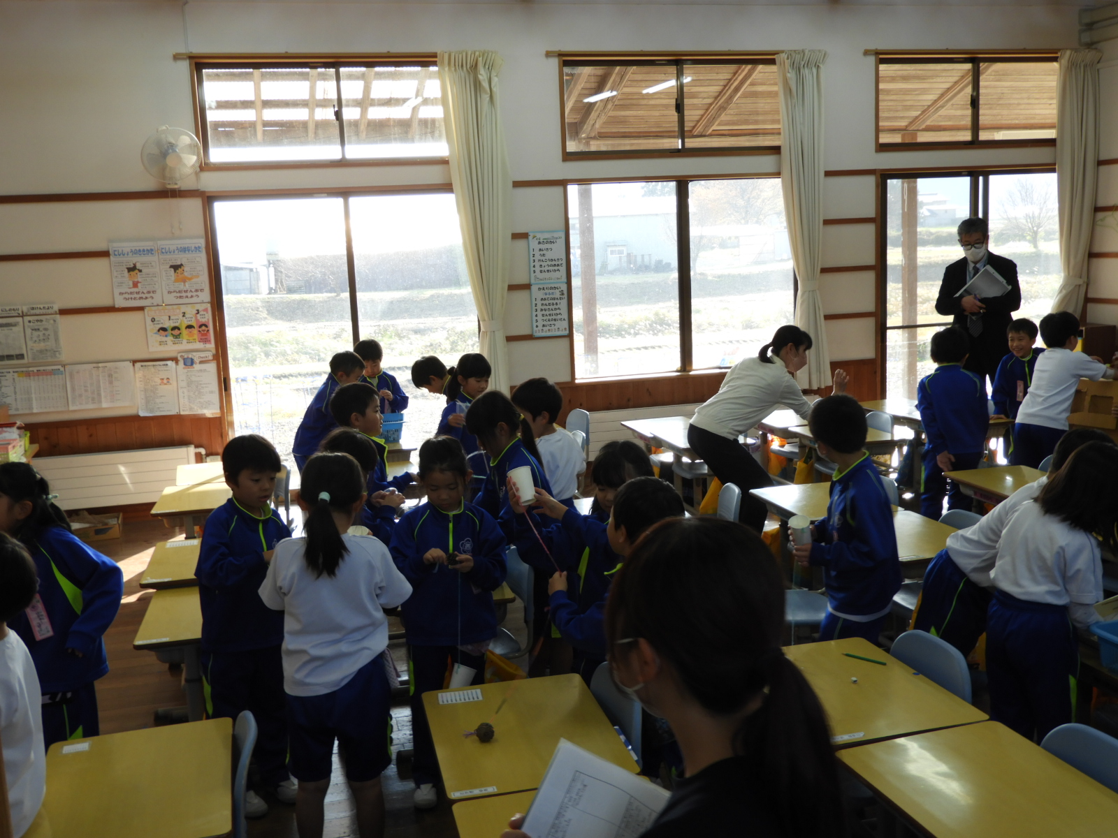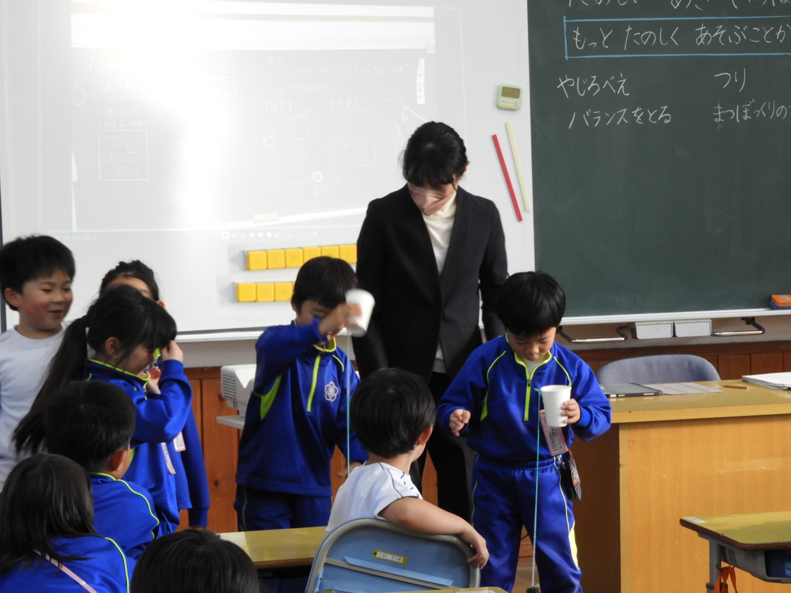 1年生の子どもたちは、生活科「たのしい あき いっぱい ~あきのおもちゃをつくろう~」の学習で、これまでに作ったおもちゃを「もっとたのしくあそぶためには」という視点で、様々工夫していました。幼稚園・保育園の先生方には、入学してからの成長した姿をたくさん見ていただきました。