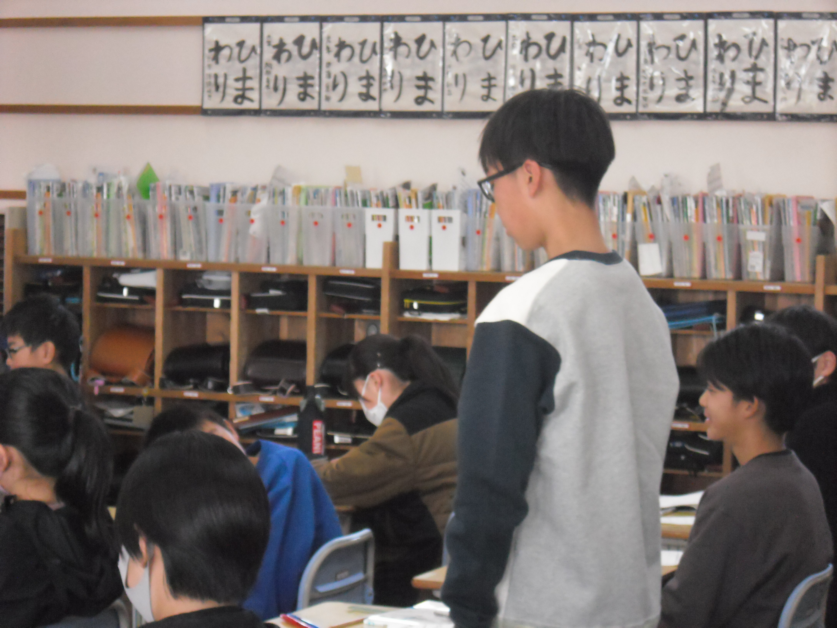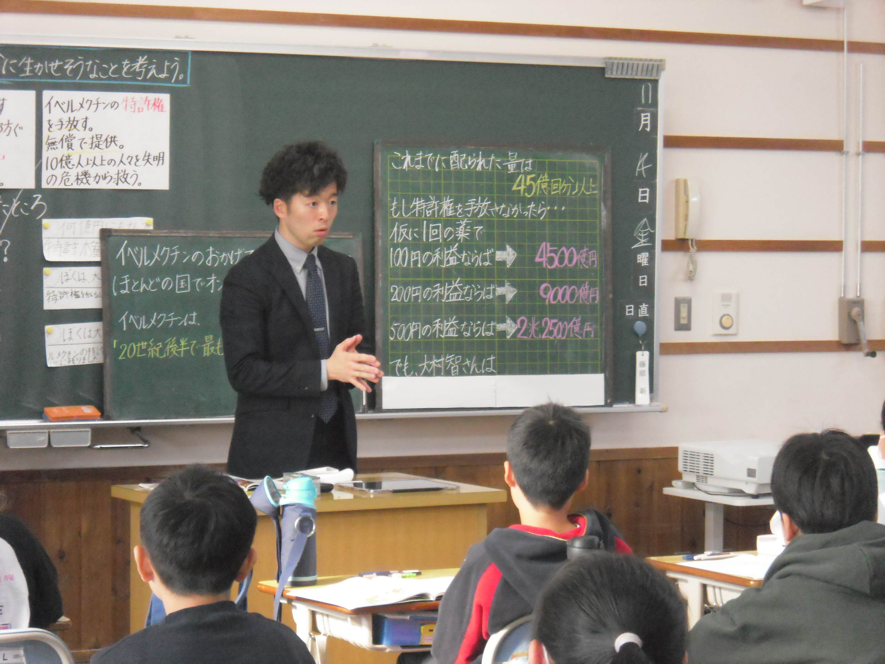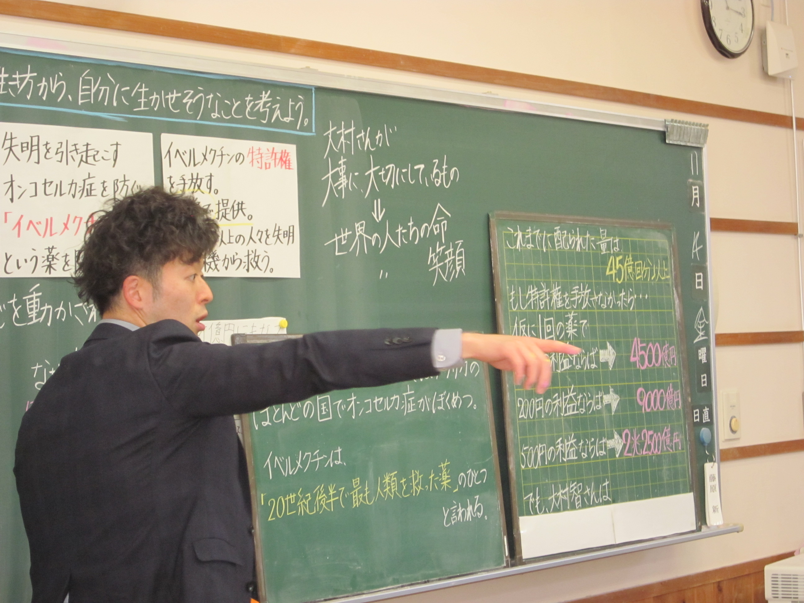 2015年にノーベル生理学・医学賞を受賞した大村智博士を題材にした「光をともした「魔法の薬」」という教材を使って、「大村智さんの生き方、考え方から、自分に生かせそうなことを考えよう」という学習課題で、みんなで考え、議論しました。感染症撲滅を目的とした新しい治療法を発見するために努力を続けた姿をもとに、自分の生き方や考え方を見直す良い機会となりました。