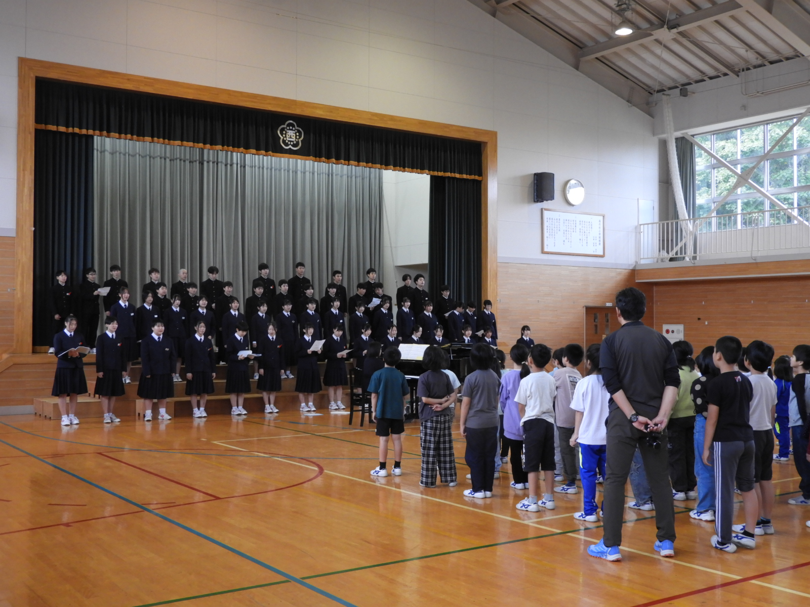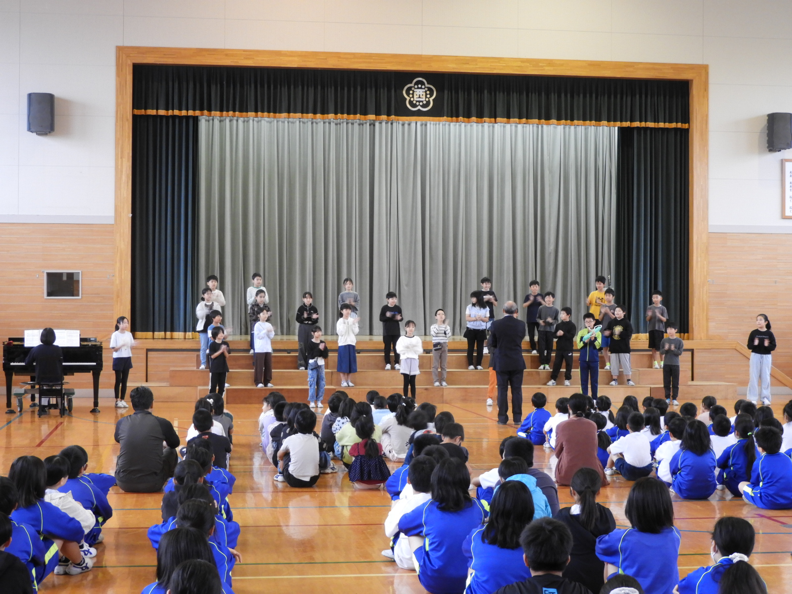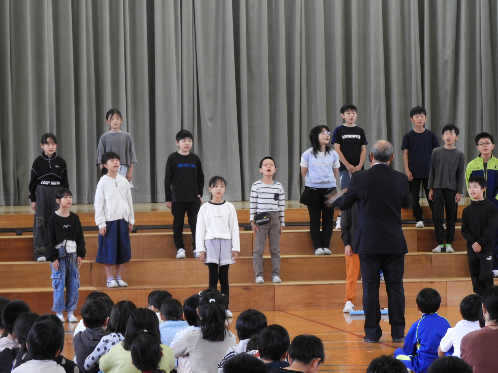 児童会執行部の進行で、まず、4年生が音楽会で発表する曲を披露しました。曲目は、「クラッピングファンタジー第7番 楽しいマーチ」「フレンドシップ」の2曲です。みなこれまでの練習の成果を精一杯の歌声で披露していました。