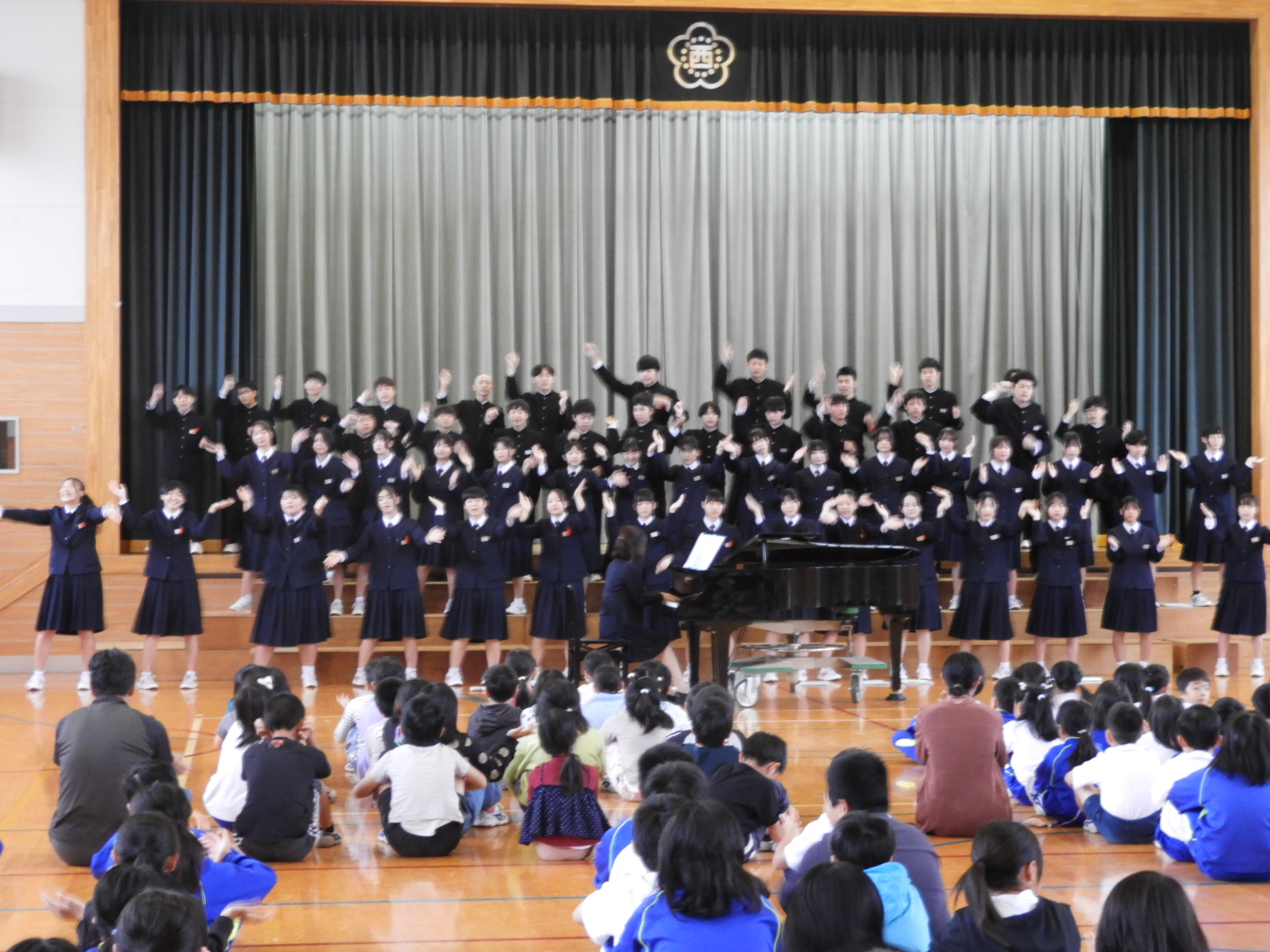 次に、紫波三中特設合唱部のみなさんは、「ヒカリ」「BELIEVE」「This is Me」の3曲を披露してくださいました。日頃の練習の成果が伝わるとても素晴らしい発表でした。小学校の子どもたちは、始まった瞬間から聴き入ってしまい、中学生のお兄さんお姉さんが奏でるハーモニーに魅了されていました。