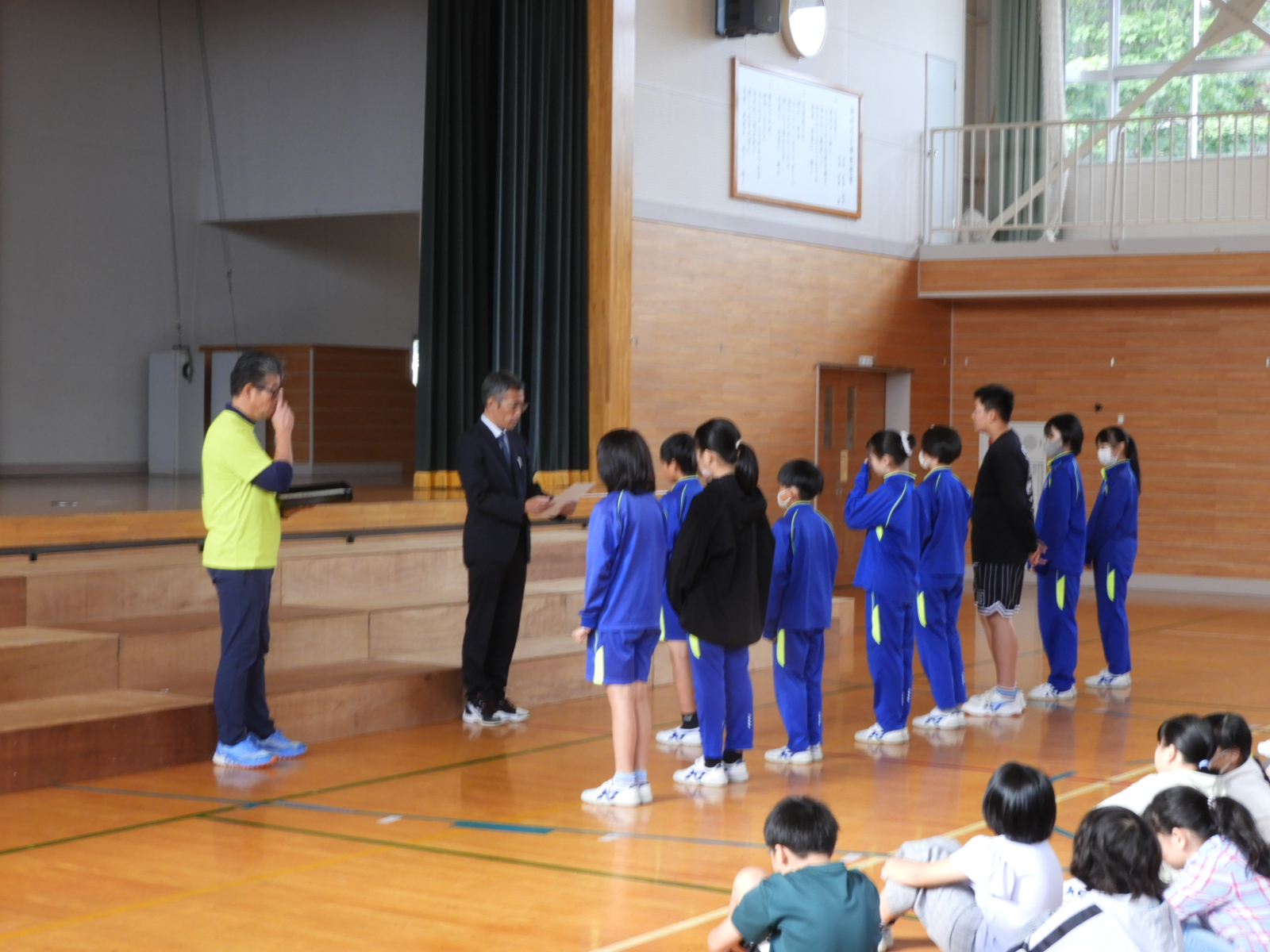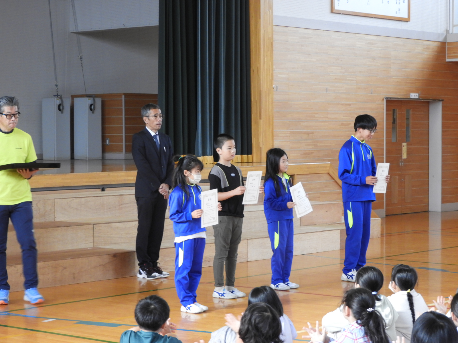 10月9日(木)朝、全校朝会の中で、学校の様々な行事や取り組みでがんばった児童をみんなで祝福する「表彰朝会」を行いました。