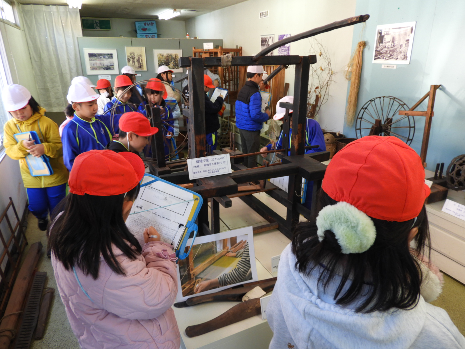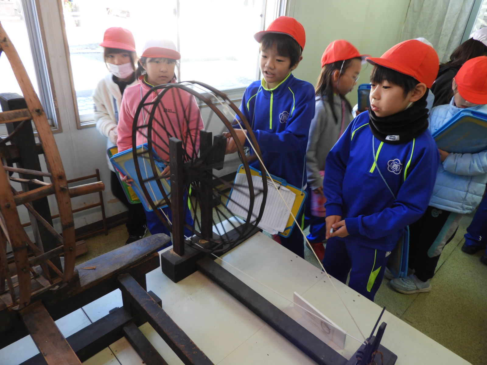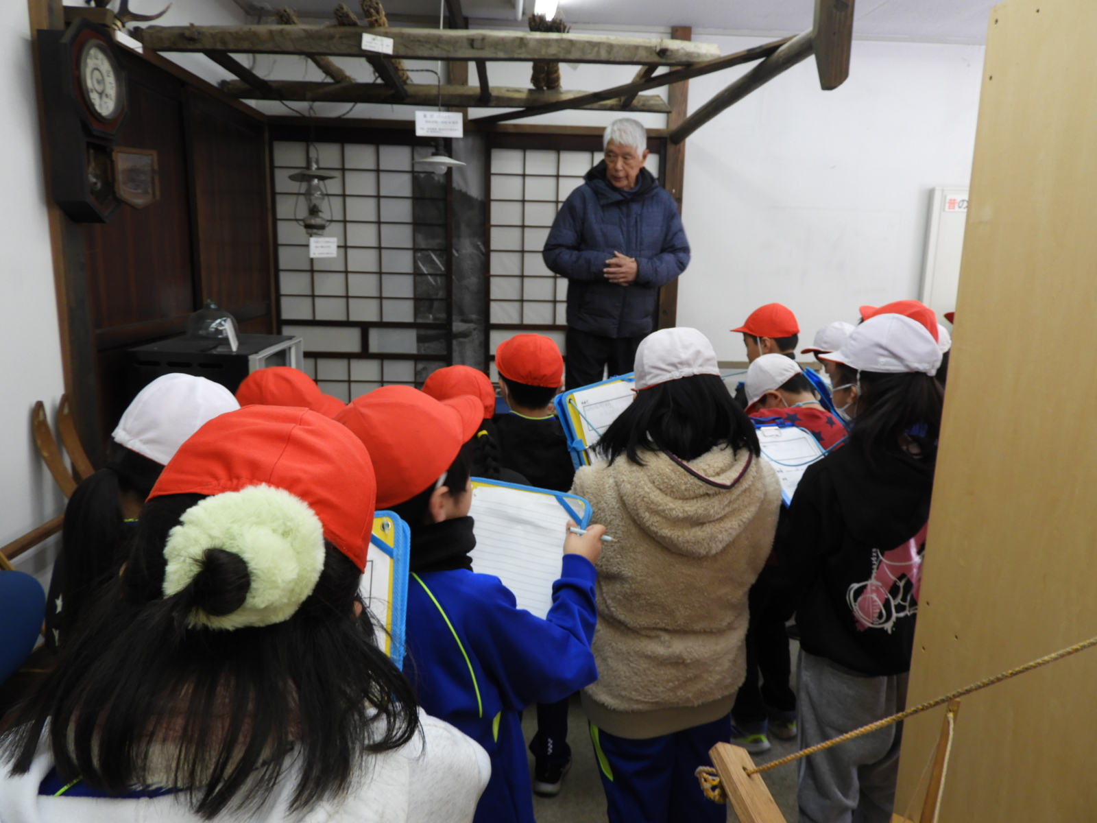 赤沢郷土資料館(赤沢公民館)では、昔の様々な道具が展示されており、地域の方に丁寧に使い方を説明していただきながら、昔の人々のくらしの様子について考えることができました。これから学習する社会科の「かわる道具とくらし」のよい事前学習ができました。