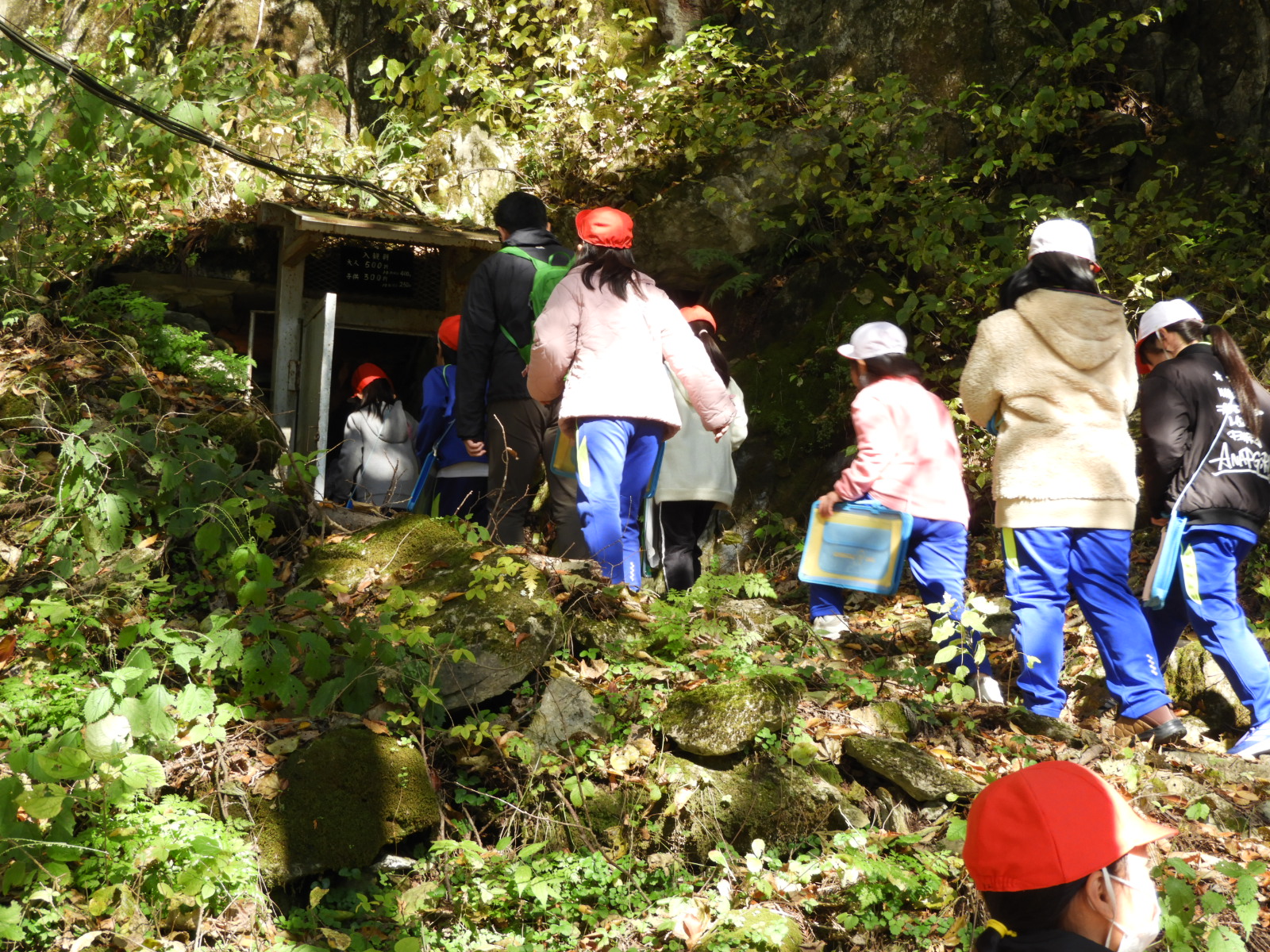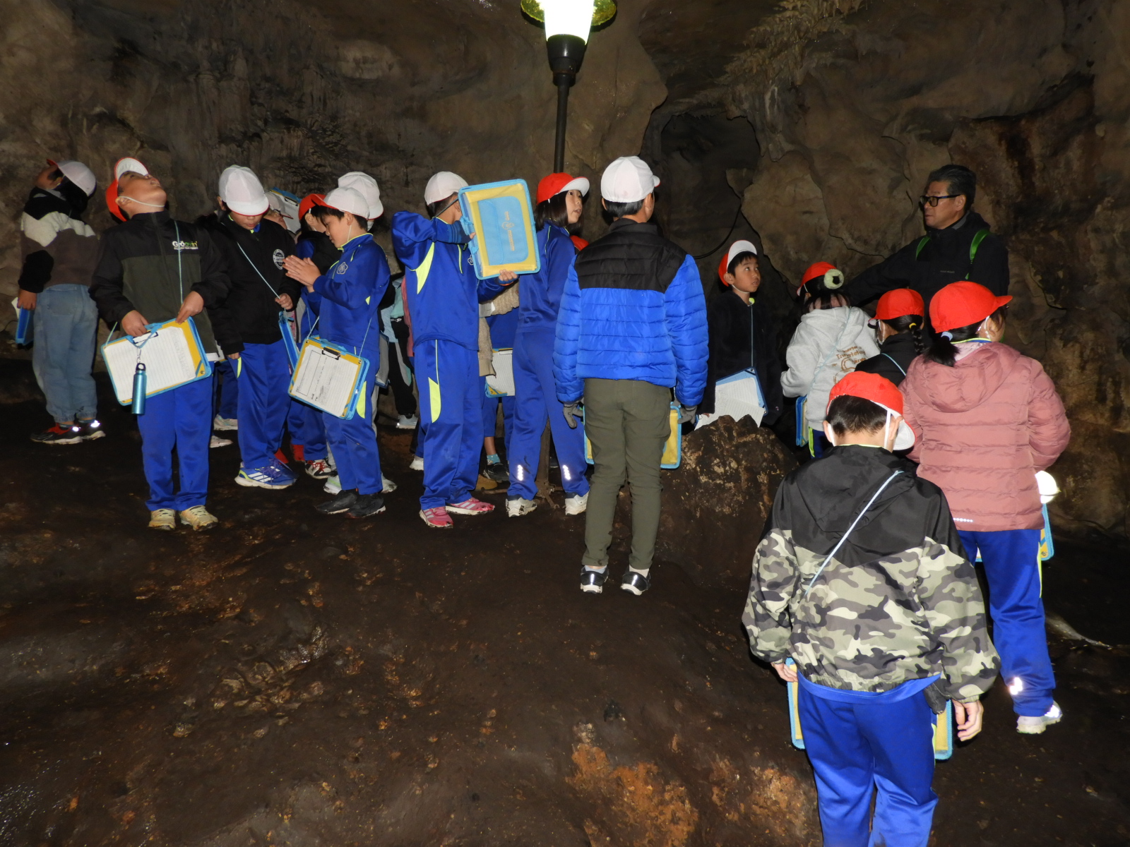 続いて、舟久保洞窟の中も見学しました。3年生の子どもたちは、探検気分で大盛り上がりでした。洞窟の中に入ると、広い空間があり、美しい鍾乳石を見ることができました。約90年前に、猟師によって偶然発見されたとのことで、本格的な発掘調査は行われていませんが、縄文時代後期から晩期にかけての土器、石器、骨角器や炉の後など、同時の人々の遺物、遺構が残されています。