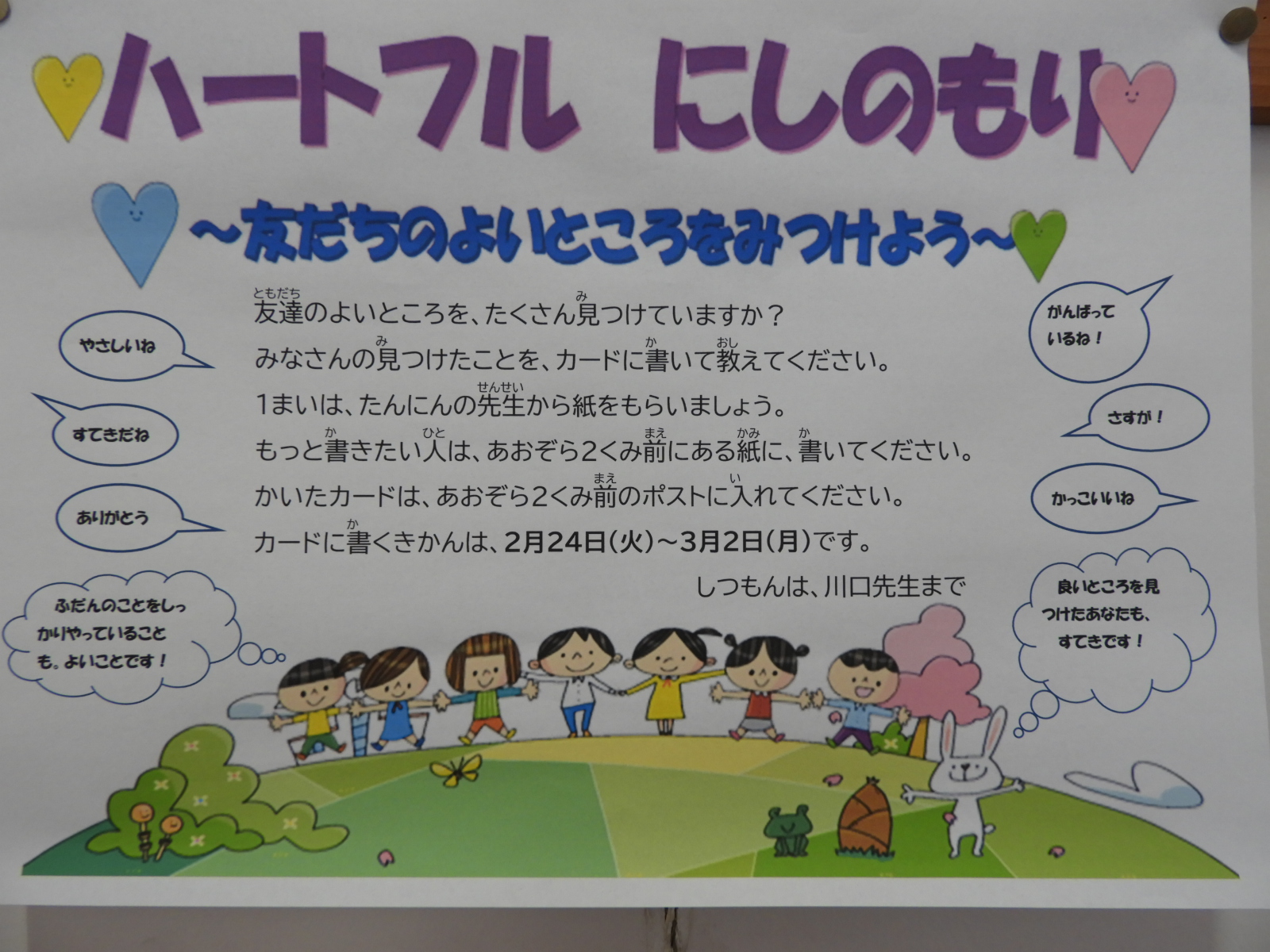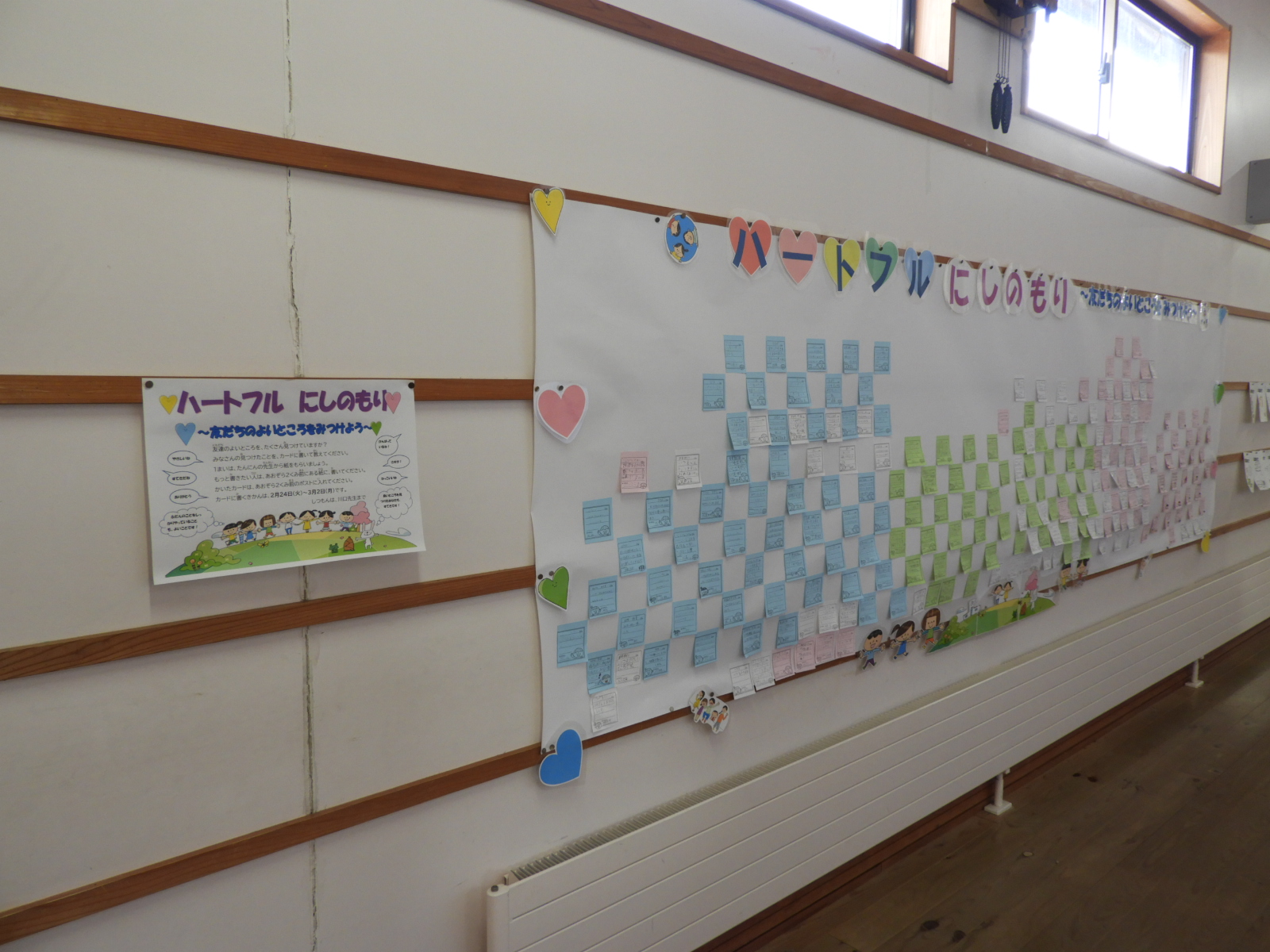 3学期、全校で「ハートフルにしのもり~友だちのよいところをみつけよう~」の取組を行いました。この取組は、本校生徒指導部主催で行われ、「いじめ防止に係る児童生徒の主体的な取組」のひとつとして、友だちのよいところを探し、それを全校に伝える活動です。
