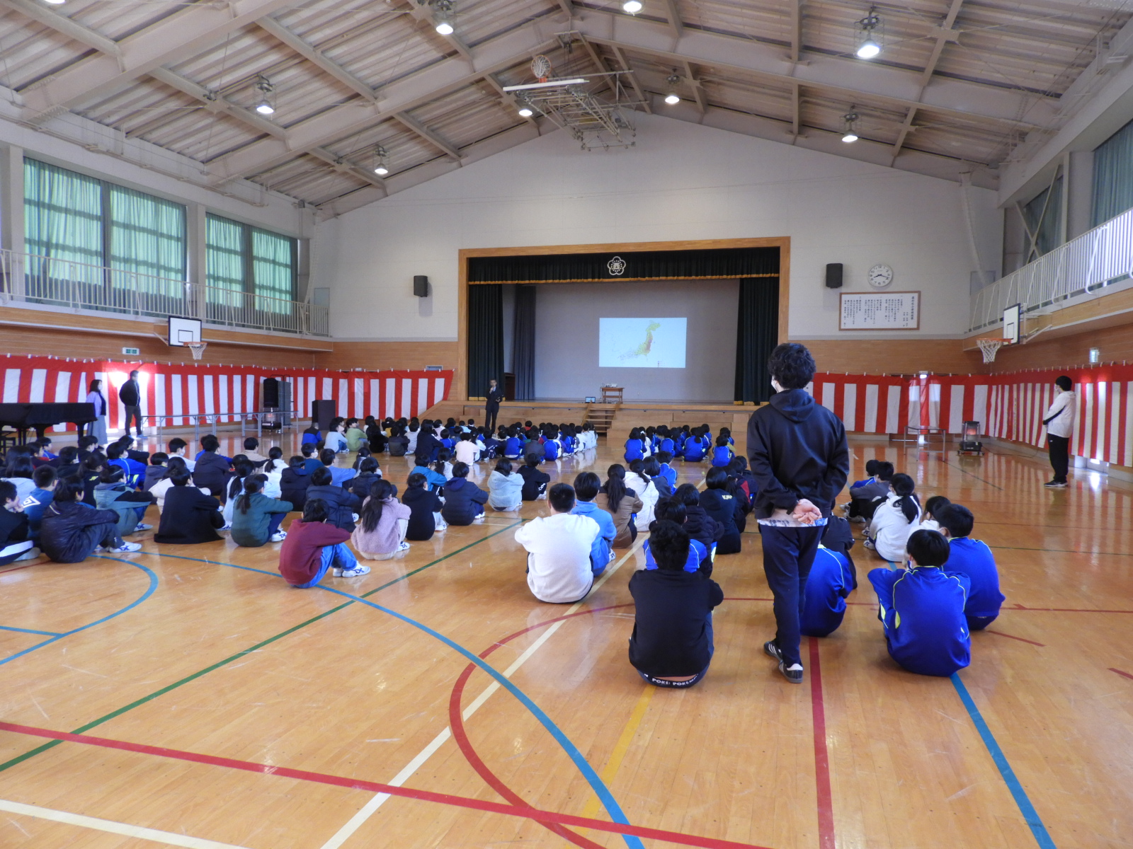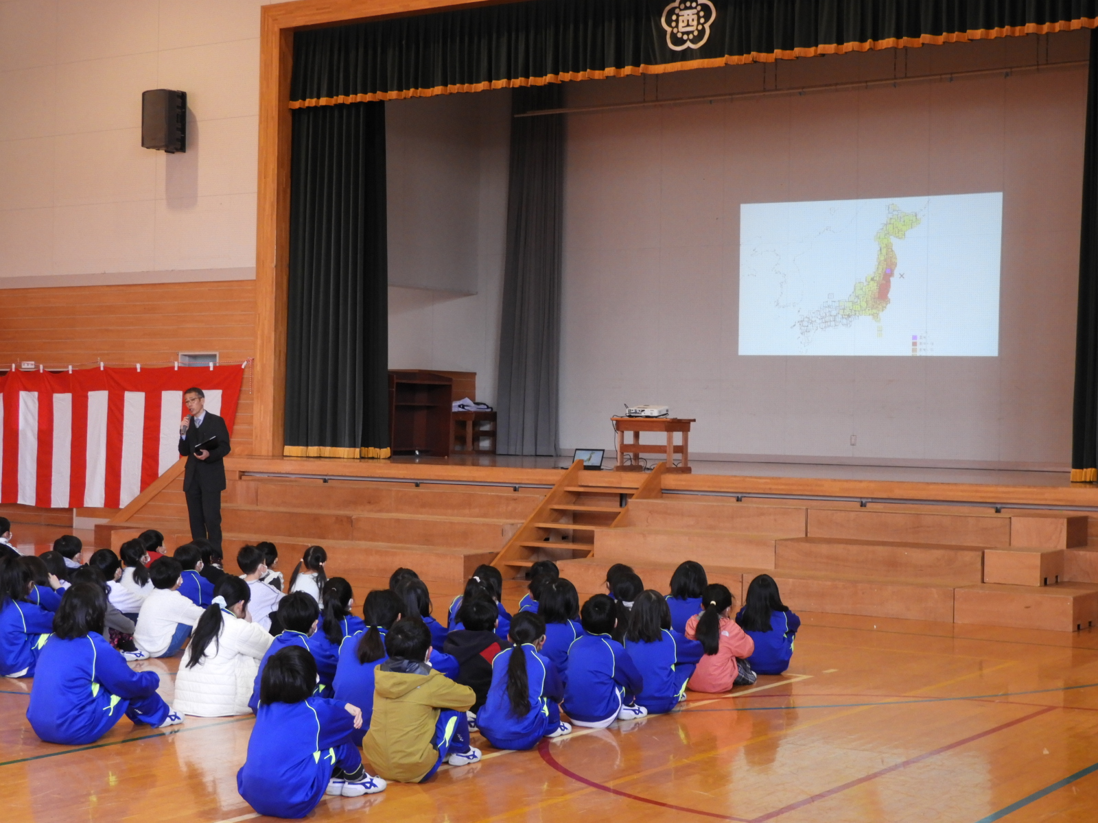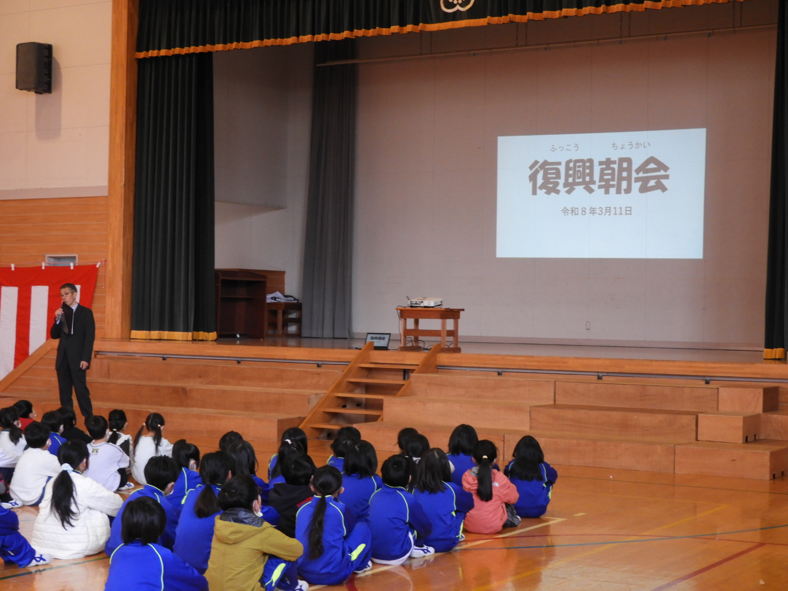 3月11日(水)、復興朝会を行い、校長先生から、震災時釜石市の避難所に支援に行った時の体験、当時の甚大な被害の様子についてお話していただきました。震災後に生まれた子どもたちですが、震災の記憶を受け継いでいくため、今後も様々な取組をしていきたいと思います。最後に、校長先生より、「気づいて」「考えて」「正しく行動する」ことを続けていきましょうと語りかけていただきました。